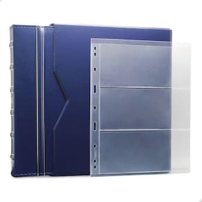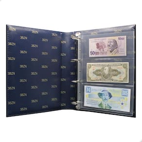O Álbum de Luxo Azul 50 Folhas para 150 Cédulas 3BZN P, é um kit de fichário que acompanha folhas para cédulas em acetato tamanho 28x21cm, a transparência da folha é alta e cristalina, de forma que é possível ver sua cédula sem interferências, e de ambos os lados: frente e verso, dessa forma é possível apreciar sua coleção da melhor forma. Esse kit de folhas é feito em um material resistente sendo o principal organizador de cédulas colecionáveis para colecionador.