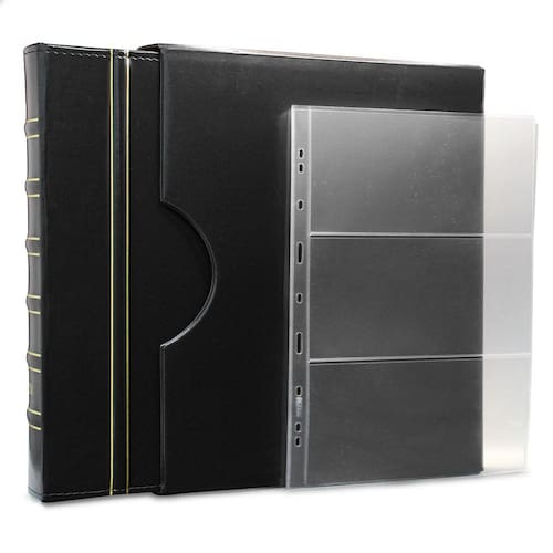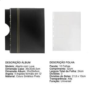 O Álbum de Luxo Preto 10 Folhas para 30 Cédulas 3BZN G é um kit de fichário que acompanha folhas para cédulas em acetato tamanho 32x24cm, a transparência da folha é alta e cristalina, de forma que é possível ver sua cédula sem interferências, e de ambos os lados: frente e verso, dessa forma é possível apreciar sua coleção da melhor forma. Esse kit de folhas é feito em um material resistente sendo o principal organizador de cédulas colecionáveis para colecionador.