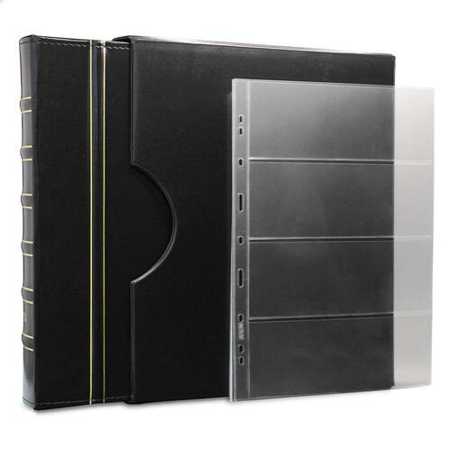 O Álbum de Luxo Preto 10 Folhas para 40 Cédulas 3BZN G é um kit de fichário que acompanha folhas para cédulas em acetato tamanho 32x24cm, a transparência da folha é alta e cristalina, de forma que é possível ver sua cédula sem interferências, e de ambos os lados: frente e verso, dessa forma é possível apreciar sua coleção da melhor forma. Esse kit de folhas é feito em um material resistente sendo o principal organizador de cédulas colecionáveis para colecionador.