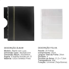 O Álbum de Luxo Preto 20 Folhas PP para 80 Cédulas 3BZN G é um kit de fichário que acompanha Folhas PP. Seu acabamento é transparente, podendo visualizar as cédulas frente e verso. Essa folha é ideal para você criar aquele mostruário que sempre desejou com sua coleção de cédulas antigas, nacionais ou estrangeras e finalmente poder mostrar sua coleção toda organizada para sua família e amigos.