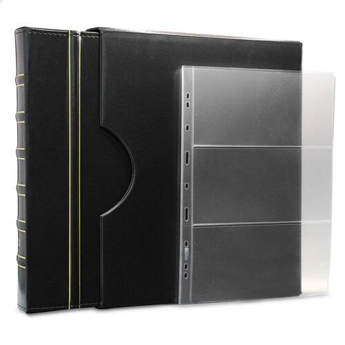 O Álbum de Luxo Preto 50 Folhas para 150 Cédulas 3BZN G é um kit de fichário que acompanha folhas para cédulas em acetato tamanho 32x24cm, a transparência da folha é alta e cristalina, de forma que é possível ver sua cédula sem interferências, e de ambos os lados: frente e verso, dessa forma é possível apreciar sua coleção da melhor forma. Esse kit de folhas é feito em um material resistente sendo o principal organizador de cédulas colecionáveis para colecionador.