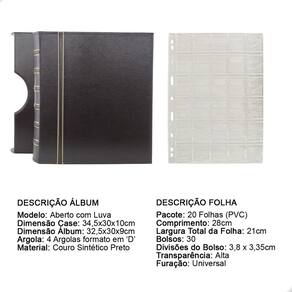 Álbum Fichário Luxo Preto Gigante 20 Folhas para Cédulas 1 Espaço 28x21