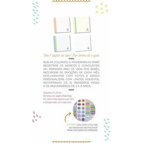 Álbum do bebê Rosa Neste álbum colorido e moderninho você vai registrar os marcos e conquistas do primeiro ano de vida dos bebês, recordar as emoções de cada mês, documentar com fotos e ainda personalizar com lindos adesivos. Momentos únicos em um álbum para guardar e compartilhar pela vida toda. O livrinho acompanha os 12 primeiros meses, o aniversário de 2 anos e o aniversário de 3 anos.