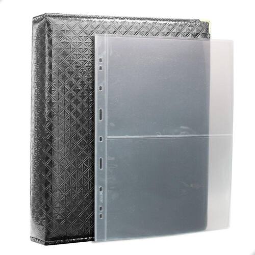 Álbum Fichário 10 Folhas para Cédulas 2 Espaços 32x24 Cobra Fosco G, é um kit de fichário que acompanha folhas para cédulas em acetato tamanho 32x24cm, a transparência da folha é alta e cristalina, de forma que é possível ver sua cédula sem interferências, e de ambos os lados: frente e verso, dessa forma é possível apreciar sua coleção da melhor forma. Esse kit de folhas é feito em um material resistente sendo o principal organizador de cédulas colecionáveis para colecionador.