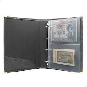Álbum Fichário 10 Folhas para Cédulas 2 Espaços 32x24 Cobra GF, é um kit de fichário que acompanha folhas para cédulas em acetato tamanho 32x24cm, a transparência da folha é alta e cristalina, de forma que é possível ver sua cédula sem interferências, e de ambos os lados: frente e verso, dessa forma é possível apreciar sua coleção da melhor forma. Esse kit de folhas é feito em um material resistente sendo o principal organizador de cédulas colecionáveis para colecionador.