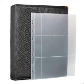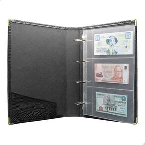 Álbum Fichário 10 Folhas para Cédulas 3 Espaços com Bolso 32x24 Cobra G, é um kit de fichário que acompanha folhas para cédulas em acetato tamanho 32x24cm, a transparência da folha é alta e cristalina, de forma que é possível ver sua cédula sem interferências, e de ambos os lados: frente e verso, dessa forma é possível apreciar sua coleção da melhor forma. Esse kit de folhas é feito em um material resistente sendo o principal organizador de cédulas colecionáveis para colecionador.