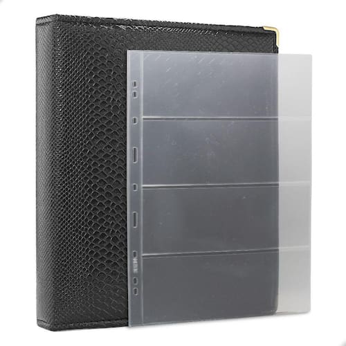 Álbum Fichário 10 Folhas para Cédulas 4 Espaços 32x24 Cobra GF, é um kit de fichário que acompanha folhas para cédulas em acetato tamanho 32x24cm, a transparência da folha é alta e cristalina, de forma que é possível ver sua cédula sem interferências, e de ambos os lados: frente e verso, dessa forma é possível apreciar sua coleção da melhor forma. Esse kit de folhas é feito em um material resistente sendo o principal organizador de cédulas colecionáveis para colecionador.