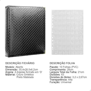 O fichário é produzido em capa sintética com cantoneiras para proteção, material de alta qualidade para armazenar com segurança e de forma organizada sua coleção, ele é muito resistente confeccionado com 4 argolas em formato ‘D’ em aço inoxidável reforçado, permitindo o encaixe da folha de até 32x24cm, processo de fabricação artesanal permitindo um excelente acabamento.