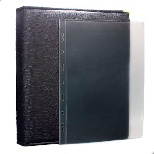 Álbum Fichário 20 Folhas para Cédulas 1 Espaço 32x24 Cobra Fosco GF, é um kit de fichário que acompanha folhas para cédulas em acetato tamanho 32x24cm, a transparência da folha é alta e cristalina, de forma que é possível ver sua cédula sem interferências, e de ambos os lados: frente e verso, dessa forma é possível apreciar sua coleção da melhor forma. Esse kit de folhas é feito em um material resistente sendo o principal organizador de cédulas colecionáveis para colecionador.