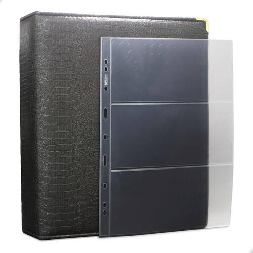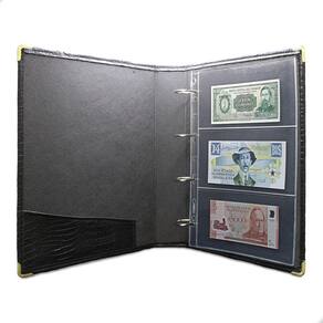 Álbum Fichário 20 Folhas para Cédulas 3 Espaços 32x24 Cobra Fosco G, é um kit de fichário que acompanha folhas para cédulas em acetato tamanho 32x24cm, a transparência da folha é alta e cristalina, de forma que é possível ver sua cédula sem interferências, e de ambos os lados: frente e verso, dessa forma é possível apreciar sua coleção da melhor forma. Esse kit de folhas é feito em um material resistente sendo o principal organizador de cédulas colecionáveis para colecionador.