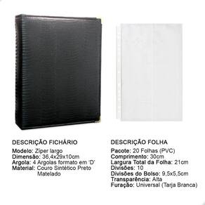 O fichário é produzido em capa sintética com cantoneiras para proteção, material de alta qualidade para armazenar com segurança e de forma organizada sua coleção, ele é muito resistente confeccionado com 4 argolas em formato ‘D’ em aço inoxidável reforçado, permitindo o encaixe da folha de até 30x21cm, processo de fabricação artesanal permitindo um excelente acabamento.