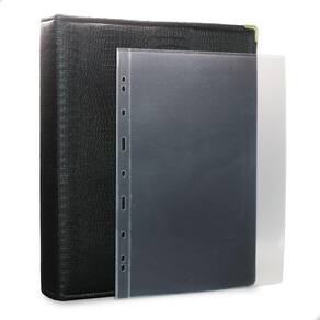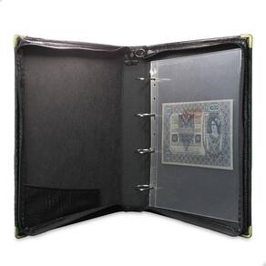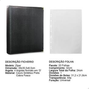 Álbum Fichário 20 Folhas para Cédulas 1 Espaço 32x24 Ziper Cobra Fosco GG, é um kit de fichário que acompanha folhas para cédulas em acetato tamanho 32x24cm, a transparência da folha é alta e cristalina, de forma que é possível ver sua cédula sem interferências, e de ambos os lados: frente e verso, dessa forma é possível apreciar sua coleção da melhor forma. Esse kit de folhas é feito em um material resistente sendo o principal organizador de cédulas colecionáveis para colecionador.