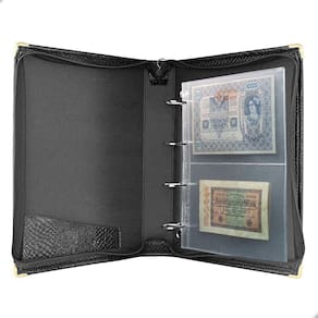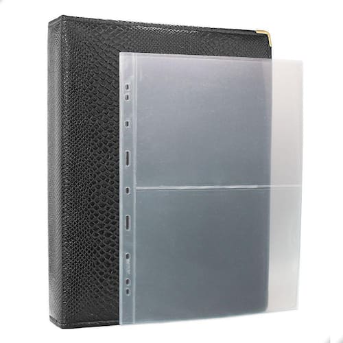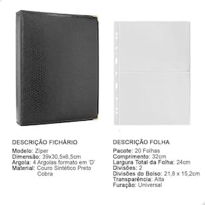 Álbum Fichário 20 Folhas para Cédulas 2 Espaços 32x24 Ziper Cobra GG, é um kit de fichário que acompanha folhas para cédulas em acetato tamanho 32x24cm, a transparência da folha é alta e cristalina, de forma que é possível ver sua cédula sem interferências, e de ambos os lados: frente e verso, dessa forma é possível apreciar sua coleção da melhor forma. Esse kit de folhas é feito em um material resistente sendo o principal organizador de cédulas colecionáveis para colecionador.