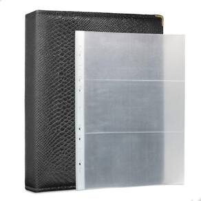 Álbum Fichário 20 Folhas PP para Cédulas 3 Espaços 32x24 Cobra G, é um kit de fichário que acompanha Folhas PP para cédulas em acetato tamanho 32x24cm, a transparência da folha é alta e cristalina, de forma que é possível ver sua cédula sem interferências, e de ambos os lados: frente e verso, dessa forma é possível apreciar sua coleção da melhor forma. Esse kit de folhas é feito em um material resistente sendo o principal organizador de cédulas colecionáveis para colecionador.