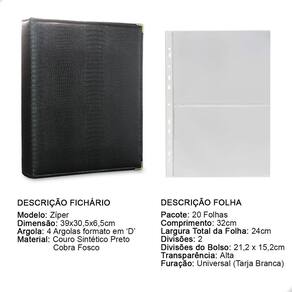 Álbum Fichário 20 Folhas PP para Cédulas 2 Espaços 32x24 Ziper Cobra Fosco GG, é um kit de fichário que acompanha Folhas PP. Seu acabamento é transparente, podendo visualizar as cédulas frente e verso. Essa folha é ideal para você criar aquele mostruário que sempre desejou com sua coleção de cédulas antigas, nacionais ou estrangeras e finalmente poder mostrar sua coleção toda organizada para sua família e amigos.