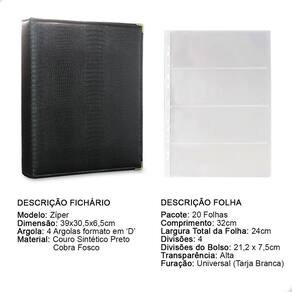 Álbum Fichário 20 Folhas PP para Cédulas 4 Espaços 32x24 Ziper Cobra Fosco GG, é um kit de fichário que acompanha Folhas PP. Seu acabamento é transparente, podendo visualizar as cédulas frente e verso. Essa folha é ideal para você criar aquele mostruário que sempre desejou com sua coleção de cédulas antigas, nacionais ou estrangeras e finalmente poder mostrar sua coleção toda organizada para sua família e amigos.