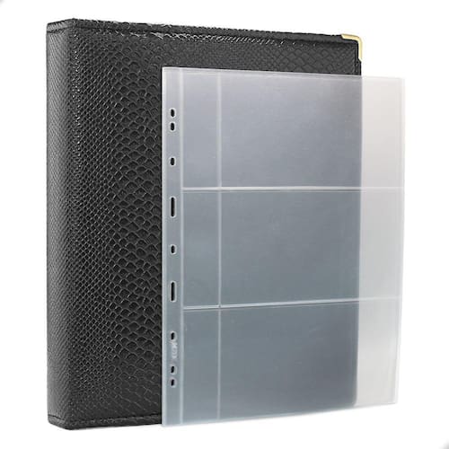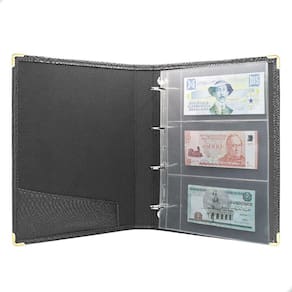 Álbum Fichário 30 Folhas para Cédulas 3 Espaços com Bolso 32x24 Cobra GF, é um kit de fichário que acompanha folhas para cédulas em acetato tamanho 32x24cm, a transparência da folha é alta e cristalina, de forma que é possível ver sua cédula sem interferências, e de ambos os lados: frente e verso, dessa forma é possível apreciar sua coleção da melhor forma. Esse kit de folhas é feito em um material resistente sendo o principal organizador de cédulas colecionáveis para colecionador.