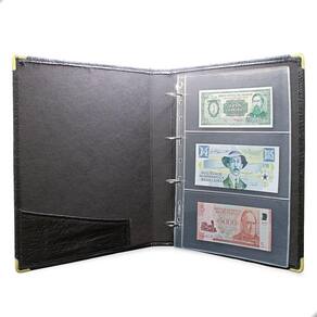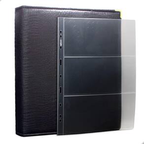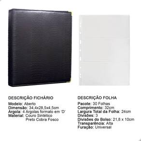 Álbum Fichário 30 Folhas para Cédulas 3 Espaços 32x24 Cobra Fosco GF, é um kit de fichário que acompanha folhas para cédulas em acetato tamanho 32x24cm, a transparência da folha é alta e cristalina, de forma que é possível ver sua cédula sem interferências, e de ambos os lados: frente e verso, dessa forma é possível apreciar sua coleção da melhor forma. Esse kit de folhas é feito em um material resistente sendo o principal organizador de cédulas colecionáveis para colecionador.