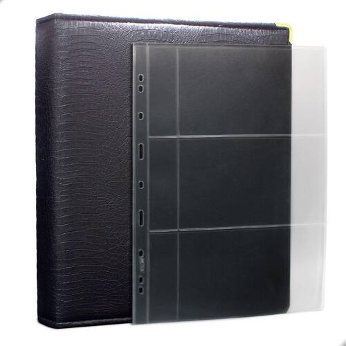 Álbum Fichário 30 Folhas para Cédulas 3 Espaços com Bolso 32x24 Cobra Fosco GF, é um kit de fichário que acompanha folhas para cédulas em acetato tamanho 32x24cm, a transparência da folha é alta e cristalina, de forma que é possível ver sua cédula sem interferências, e de ambos os lados: frente e verso, dessa forma é possível apreciar sua coleção da melhor forma. Esse kit de folhas é feito em um material resistente sendo o principal organizador de cédulas colecionáveis para colecionador.