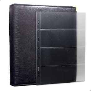 Álbum Fichário 30 Folhas para Cédulas 4 Espaços 32x24 Cobra Fosco GF, é um kit de fichário que acompanha folhas para cédulas em acetato tamanho 32x24cm, a transparência da folha é alta e cristalina, de forma que é possível ver sua cédula sem interferências, e de ambos os lados: frente e verso, dessa forma é possível apreciar sua coleção da melhor forma. Esse kit de folhas é feito em um material resistente sendo o principal organizador de cédulas colecionáveis para colecionador.