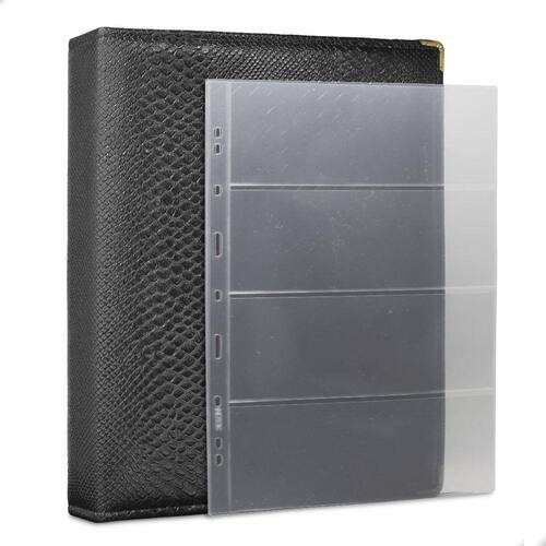 Álbum Fichário 30 Folhas para Cédulas 4 Espaços 32x24 Cobra G, é um kit de fichário que acompanha folhas para cédulas em acetato tamanho 32x24cm, a transparência da folha é alta e cristalina, de forma que é possível ver sua cédula sem interferências, e de ambos os lados: frente e verso, dessa forma é possível apreciar sua coleção da melhor forma. Esse kit de folhas é feito em um material resistente sendo o principal organizador de cédulas colecionáveis para colecionador.