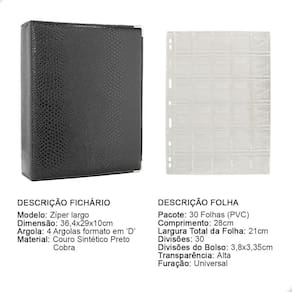O fichário é produzido em capa sintética com cantoneiras para proteção, material de alta qualidade para armazenar com segurança e de forma organizada sua coleção, ele é muito resistente confeccionado com 4 argolas em formato ‘D’ em aço inoxidável reforçado, permitindo o encaixe da folha de até 28x21cm, processo de fabricação artesanal permitindo um excelente acabamento.
