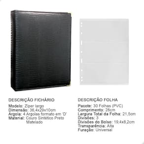 O fichário é produzido em capa sintética com cantoneiras para proteção, material de alta qualidade para armazenar com segurança e de forma organizada sua coleção, ele é muito resistente confeccionado com 4 argolas em formato ‘D’ em aço inoxidável reforçado, permitindo o encaixe da folha de até 28x21cm, processo de fabricação artesanal permitindo um excelente acabamento.