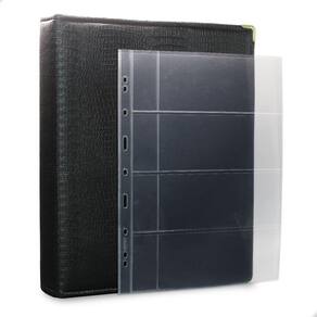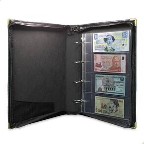 Álbum Fichário 30 Folhas para Cédulas 4 Espaços com Bolso 32x24 Ziper Cobra Fosco GG, é um kit de fichário que acompanha folhas para cédulas em acetato tamanho 32x24cm, a transparência da folha é alta e cristalina, de forma que é possível ver sua cédula sem interferências, e de ambos os lados: frente e verso, dessa forma é possível apreciar sua coleção da melhor forma. Esse kit de folhas é feito em um material resistente sendo o principal organizador de cédulas colecionáveis para colecionador.