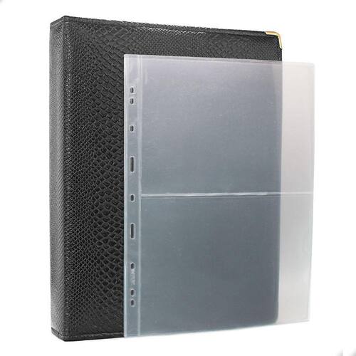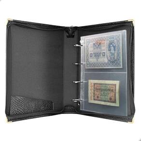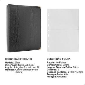 Álbum Fichário 40 Folhas para Cédulas 2 Espaços 32x24 Ziper Cobra GG, é um kit de fichário que acompanha folhas para cédulas em acetato tamanho 32x24cm, a transparência da folha é alta e cristalina, de forma que é possível ver sua cédula sem interferências, e de ambos os lados: frente e verso, dessa forma é possível apreciar sua coleção da melhor forma. Esse kit de folhas é feito em um material resistente sendo o principal organizador de cédulas colecionáveis para colecionador.