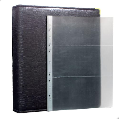 Álbum Fichário 40 Folhas PP para Cédulas 3 Espaços 32x24 Cobra Fosco GF, é um kit de fichário que acompanha Folhas PP. Seu acabamento é transparente, podendo visualizar as cédulas frente e verso. Essa folha é ideal para você criar aquele mostruário que sempre desejou com sua coleção de cédulas antigas, nacionais ou estrangeras e finalmente poder mostrar sua coleção toda organizada para sua família e amigos.