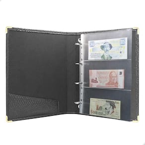 Álbum Fichário 40 Folhas PP para Cédulas 3 Espaços 32x24 Cobra GF, é um kit de fichário que acompanha Folhas PP. Seu acabamento é transparente, podendo visualizar as cédulas frente e verso. Essa folha é ideal para você criar aquele mostruário que sempre desejou com sua coleção de cédulas antigas, nacionais ou estrangeras e finalmente poder mostrar sua coleção toda organizada para sua família e amigos.