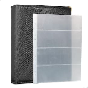 Álbum Fichário 40 Folhas PP para Cédulas 4 Espaços 32x24 Cobra G, é um kit de fichário que acompanha Folhas PP para cédulas em acetato tamanho 32x24cm, a transparência da folha é alta e cristalina, de forma que é possível ver sua cédula sem interferências, e de ambos os lados: frente e verso, dessa forma é possível apreciar sua coleção da melhor forma. Esse kit de folhas é feito em um material resistente sendo o principal organizador de cédulas colecionáveis para colecionador.