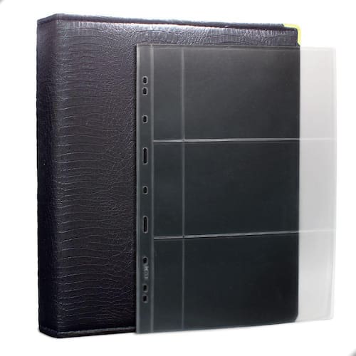 Álbum Fichário 50 Folhas para Cédulas 3 Espaços com Bolso 32x24 Cobra Fosco GF, é um kit de fichário que acompanha folhas para cédulas em acetato tamanho 32x24cm, a transparência da folha é alta e cristalina, de forma que é possível ver sua cédula sem interferências, e de ambos os lados: frente e verso, dessa forma é possível apreciar sua coleção da melhor forma. Esse kit de folhas é feito em um material resistente sendo o principal organizador de cédulas colecionáveis para colecionador.