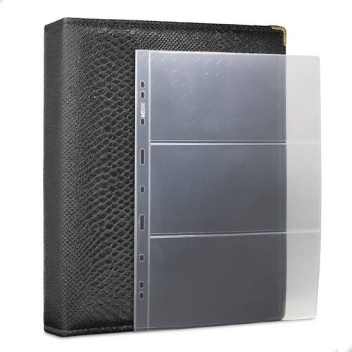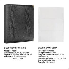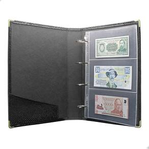 Álbum Fichário 50 Folhas para Cédulas 3 Espaços 32x24 Cobra G, é um kit de fichário que acompanha folhas para cédulas em acetato tamanho 32x24cm, a transparência da folha é alta e cristalina, de forma que é possível ver sua cédula sem interferências, e de ambos os lados: frente e verso, dessa forma é possível apreciar sua coleção da melhor forma. Esse kit de folhas é feito em um material resistente sendo o principal organizador de cédulas colecionáveis para colecionador.