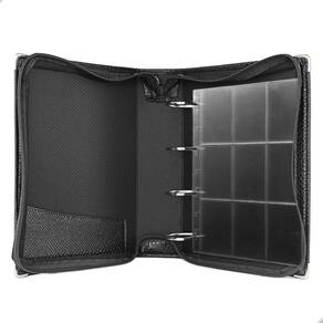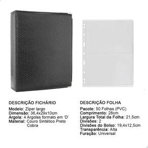O fichário é produzido em capa sintética com cantoneiras para proteção, material de alta qualidade para armazenar com segurança e de forma organizada sua coleção, ele é muito resistente confeccionado com 4 argolas em formato ‘D’ em aço inoxidável reforçado, permitindo o encaixe da folha de até 28x21cm, processo de fabricação artesanal permitindo um excelente acabamento.