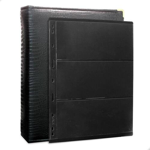 O Álbum Fichário 50 Folhas para Selos 3 Espaços 28x21 Cobra Fosco XL, é um kit de fichário que acompanha folhas para selos em acetato preto tamanho 28x21cm, a transparência da folha é alta e cristalina, de forma que é possível ver sua cédula sem interferências, dessa forma é possível apreciar sua coleção da melhor forma. Esse kit de folhas é feito em um material resistente sendo o principal organizador de cédulas colecionáveis para colecionador.