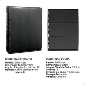 O fichário é produzido em capa sintética com cantoneiras para proteção, material de alta qualidade para armazenar com segurança e de forma organizada sua coleção, ele é muito resistente confeccionado com 4 argolas em formato ‘D’ em aço inoxidável reforçado, permitindo o encaixe da folha de até 28x21cm, processo de fabricação artesanal permitindo um excelente acabamento.
