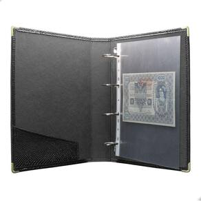 Álbum Fichário 50 Folhas PP para Cédulas 1 Espaço 32x24 Cobra G, é um kit de fichário que acompanha Folhas PP para cédulas em acetato tamanho 32x24cm, a transparência da folha é alta e cristalina, de forma que é possível ver sua cédula sem interferências, e de ambos os lados: frente e verso, dessa forma é possível apreciar sua coleção da melhor forma. Esse kit de folhas é feito em um material resistente sendo o principal organizador de cédulas colecionáveis para colecionador.