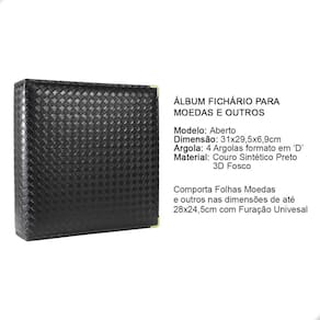 Álbum Fichário para Moedas 3D Fosco MO Álbum Fichário para Moedas 3D Fosco M é produzido em capa sintético com cantoneiras para proteção. O material é de alta qualidade para armazenar com segurança e de forma organizada sua coleção de moedas e outros materiais.É confeccionado com 4 argolas em formato em 'D' em aço inoxidável reforçado permitindo encaixe de folha de inserção de até 28x24,5cm.O processo de fabricação é artesanal garantindo um material de excelente acabamento.O álbum comporta folhas nas seguintes dimensões:PARA MOEDAS:- 30 folhas de 20 bolsos 28x24,5cm (vazias)- 30 folhas de 20 bolsos 28x24cm (vazias)- 30 folhas de 20 bolsos 28x23cm (vazias)OBS: A quantidade de folhas foi calculado com as mesmas vazias, podendo assim variar de acordo com a espessura da moeda. Não é aconselhado completar o álbum com sua capacidade total de folhas com moedas por conta do peso.CARACTERÍSTICAS:Material: SintéticoCor: PretoDimensão do Fichário: 31x29,5x6,9cmQuantidade de argolas: 4 (furação universal)Espaço entre argolas: 8cmOBS: Não acompanha folhas. Não é aconselhável colocar no mesmo álbum cédulas e moedas juntas Marca: Caravelas Coleções