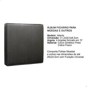 O Album Fichário para Moedas Cobra M é produzido em capa sintético com cantoneiras para proteção. O material é de alta qualidade para armazenar com segurança e de forma organizada sua coleção de moedas e outros materiais.