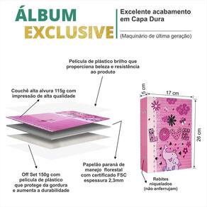album de papelao parana duro embalado em papel couche impresso e plastificado com brilho. Parte interna com 26 folhas plásticas de polipropileno rebitados com capacidade de 208 fotos 10x15
