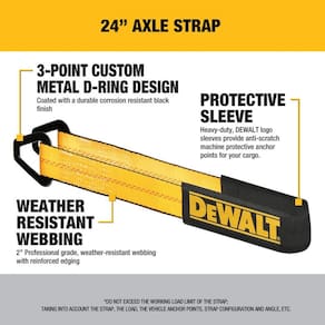 DEWALT As tiras de eixo são projetadas sob medida com correias resistentes que resistem à abrasão, combinadas com anéis D revestidos pretos de aço carbono. A manga de DEWALT revestida oferece resistência e durabilidade adicionais. Estas tiras DEWALT são a solução ideal para ajudar a proteger seu veículo, máquina ou equipamento – com 1,5 kg. de capacidade de carga de trabalho segura. Estas tiras de eixo são DEWALT, Guaranteed Tough, disponíveis nos modelos de 61 cm e 91 cm. - Alça de eixo durável de 5 cm de largura x 61 cm de comprimento com 1,5 kg. Força de trabalho e 4,5 kg. resistência à ruptura - Design de anel em D de metal personalizado de 3 pontos - revestido com um acabamento preto durável e resistente à corrosão - As mangas protetoras resistentes do logotipo da DEWALT fornecem um ponto de ancoragem antiarranhões para sua carga e garantem a integridade e durabilidade da alça - Correia resistente ao clima com bordas reforçadas - Fácil de usar e a solução ideal para ajudar a proteger seu veículo, máquina ou equipamento