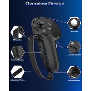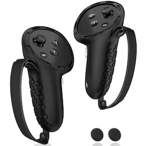 CapaAMZDM Controller Grip for Oculus Meta Quest 3S Oculus Quest 3 VR Accessories Grips Cover for VR Touch Controllers Straps Silicone Covers Protector with Non-Slip Thumbstick Covers 1Pair Black - Proteção avançada do controlador: proteja seu Oculus Quest 3 com as alças de controle da AMZDM, garantindo uma aderência segura e estável durante suas sessões de jogo, oferecendo uma camada adicional de proteção para o seu dispositivo. - Conforto e controle incomparáveis: mergulhe em sessões de jogos prolongadas com facilidade. Seu design ergonômico oferece um ajuste superior, permitindo que você jogue por longos períodos sem desconforto. A superfície antiderrapante aprimorada reduz o suor da palma e a fadiga, garantindo controle preciso e conforto duradouro. Além disso, nosso pacote inclui um par de joystick texturizado - Personalizável e conveniente: estas alças de controle Oculus apresentam tiras elásticas de couro vegano, oferecendo excelente resistência à abrasão, elasticidade e resistência ao deslizamento. Eles são confortáveis e facilmente ajustáveis para caber em mãos da maioria dos tamanhos, proporcionando uma experiência de jogo segura e garantindo que você possa acessar todos os botões com facilidade. - Feitas para durar: feitas de material de silicone premium com um padrão antiderrapante exclusivo, essas alças oferecem durabilidade duradoura e protegem seu Oculus Quest 3 de suor, poeira e arranhões. Depois de jogar por muito tempo, você pode limpá-lo com água ou pano úmido com facilidade. - Fácil de usar: projetado especificamente para controles de toque Oculus Quest 3, essas alças oferecem um ajuste perfeito e são incrivelmente fáceis de instalar e remover. Melhore sua configuração de jogos VR sem o incômodo de processos de configuração complicados.