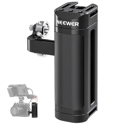 NEEWER Alça lateral compatível com gaiola de câmera SmallRig NEEWER, equipamento leve com parafusos duplos de 1/10.2 cm (espaçamento de 18 mm-20 mm), roscas de 1/10.2 cm, sapata fria, ajustável para - ?Alça lateral universal ultraleve? Este acessório de câmera compacto e leve (170 g) se fixa à gaiola da sua câmera ou equipamento de vídeo por meio de dois parafusos de polegar de 1/10.2 cm. Com espaçamento de parafuso ajustável de 18 a 20 mm, é compatível com gaiolas SmallRig e vários compartimentos de câmera NEEWER (CA020 CA019 CA014 CA011 CA002) e ajuda você a estabilizar uma câmera DSLR ou digital sem espelho de até 15 kg (não compatível com Tilta) - Posição vertical ajustável: a alça lateral pode deslizar verticalmente para obter a posição portátil ideal. Uma chave hexagonal em forma de L armazenada magneticamente dentro da alça permite que você afrouxe e aperte os parafusos sem esforço - ?Adequado para mão esquerda/direita? Projetado para operação com a mão esquerda e direita, o conector da alça pode ser destacado e instalado em ambos os lados do compartimento da câmera. Também inclui um compartimento para cordão para prevenção de quedas (laynard não incluído). - ?Acessório fácil? Os orifícios de rosca de 0,6 cm na parte superior e inferior podem conectar braços mágicos, suportes de cabeça esférica e outros pequenos acessórios ou equipamentos. E um suporte de sapata fria pode conectar uma luz LED, microfone ou monitor para melhorar a qualidade da fotografia e videografia da câmera, como filmagem, gravação de vídeo TikTok do YouTube, transmissão ao vivo, etc. - ?Estrutura ergonômica? Feito de ABS premium, PC e liga de alumínio, este equipamento fotográfico para câmera é resistente, mas leve para fotos ao ar livre. As almofadas de borracha antiderrapantes criam uma aderência confortável e firme para gravar vídeos enquanto estiver em movimento