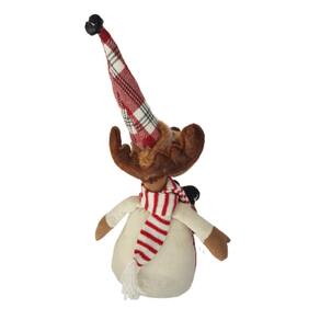 Alce sentado com estrutura em fibra e tecido, com perninhas de miçanga de madeira colorida, roupa e toca em tecido xadrez e suspensório com Botões. As orelha marrom em feltro com enchimento, o cachecol de tricô vermelho e branco e as barras do gorro e pernas com pele caramelo são um destaque que deixa ele ainda mais fofo e charmoso. Item confeccionado com materiais PREMIUM e acabamento finíssimo, perfeito. Digno de elogios!