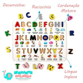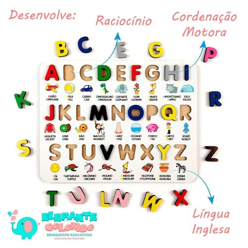 Alfabeto Ilustrado Pedagógico 3D - Brinquedo Educativo Montessoriano Como aprender o alfabeto de um jeito divertido Este é um Jogo de Tabuleiro no estilo de quebra-cabeça que contém 26 letras para encaixar na base. Logo abaixo de cada letra do alfabeto tem uma figura, seja um objeto, animal, ou outro símbolo, que começa com a respectiva letra. As crianças vão relacionar as letras às figuras por associação, corrigindo as palavras do tabuleiro e, assim, vão assimilar a ordem do alfabeto e consequentemente aprendendo palavras. As crianças são curiosas e gostam de explorar. Brinquedos educativos como esse quebra-cabeça de alfabeto tabuleiro sensorial, tabuleiro montessori ajudam as crianças a explorar e aprender de uma forma divertida e segura. Gradualmente a criança domina as habilidades diárias e se torna independente. Esse jogo aprimora não apenas as habilidades motoras finas, mas também auxilia no processo de memorização do alfabeto e aprendizado de leitura das primeiras palavras. O tabuleiro também possibilita outras formas de aprendizado, criando jogos interessantes. A criança pode ser incentivada a montar palavras, fora do tabuleiro, com as letras e de forma que não se repitam, como: uva, amor, cola, bola, lua, vaso, urso, foca, pato, luva, milho, escola, gato, miado, rato, queijo, a criança pode criar outras. Quantas palavras serão que vocês conseguirão criar juntos Aprender assim é garantida. Ótima opção de presente para meninos e meninas. BENEFÍCIOS: - Elementos de toque para o desenvolvimento de habilidades lógicas, motoras e criativas. - Reconhecimento das formas das letras do alfabeto - Associação das letras à ordem alfabética - Desenvolvimento de desenvolvimento motor - Criatividade - Concentração - Fabricamos nossos brinquedos com núcleos modernos e sofisticados para atrair a atenção das crianças - Tamanho ideal para brincar no quarto da criança ou na sala e também para levar em uma viagem - Acompanha embalagem de algodão para guardar as letras CARACTERÍSTICAS Adequado para crianças a partir dos 4 anos. Nossos tabuleiros são feitos de madeira prensada, MDF, com corte a laser e impressão digital UV direta sobre a madeira, não tem adesivo. Dimensões: Largura: 31cm Altura: 24cm Espressura da letra: 0,6cm Espessura da placa: 0,6cm Altura das letras: 3cm Peso: 550 gramas Uso interno, não pode molhar. Em processo de certificação INMETRO: Nº Processo Brics 8352/2022-BRI Homologação Inmetro: IP-BRI-1301/2022-45