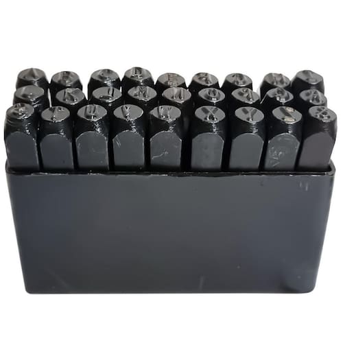 Jogo com 27 peças para bater. Letras de A a Z letras maiúsculas e & caractere especial . Indicado para marcação e gravação manual de informações em aço, alumínio, cobre, couro e etc.