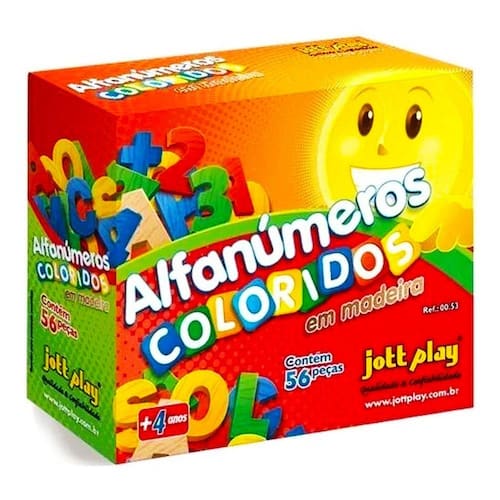 Alfanúmeros coloridos com 56 peças. Letras, números e sinais recortados em madeira colorida. Conjunto de letras e números em madeira colorida recortados; contendo números de 0 á 9 e 40 letras a a z com algumas duplicadas e 6 peças para os sinais medindo 5 x 5 x 1 cm, aproximadamente. Kit com 56 peças acondicionadas em caixa de papelão medindo 20x16x8cm. Objetivo: contribui para estimular a observação, comparação, raciocínio, habilidade de escrita e comunicação. Ajuda no reconhecimento dos algarismos e sinais onde pode ser trabalhado a noção de quantidades: por exemplo mostra o numeral 0 e pede para a criança escrever com as letras z, e, r, 0, que compõe o alfabeto. OCP0061 CE-BRI/NNAC-00128-6A