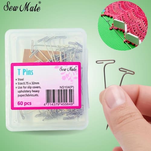 Alfinetes em T para Blocagem Sew Mate C/60 Unidades Alfinetes em T para Blocagem Sew Mate, são resistentes à ferrugem e feitos de aço inoxidável. Ideal para fixar seus projetos em suas extremidades Seu formato ajuda na sua utilização, facilitando na hora de manipulá-lo. Perfeito para usar em projetos de renda, capas, estofados, cartolina, ou para juntar camadas de tecido na execução do alcochoado.