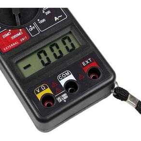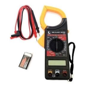 01 - alicate amperímetro com multímetro portátil com visor de lcd, possui estojo de transporte, pontas de prova e bateria - marca lotus.